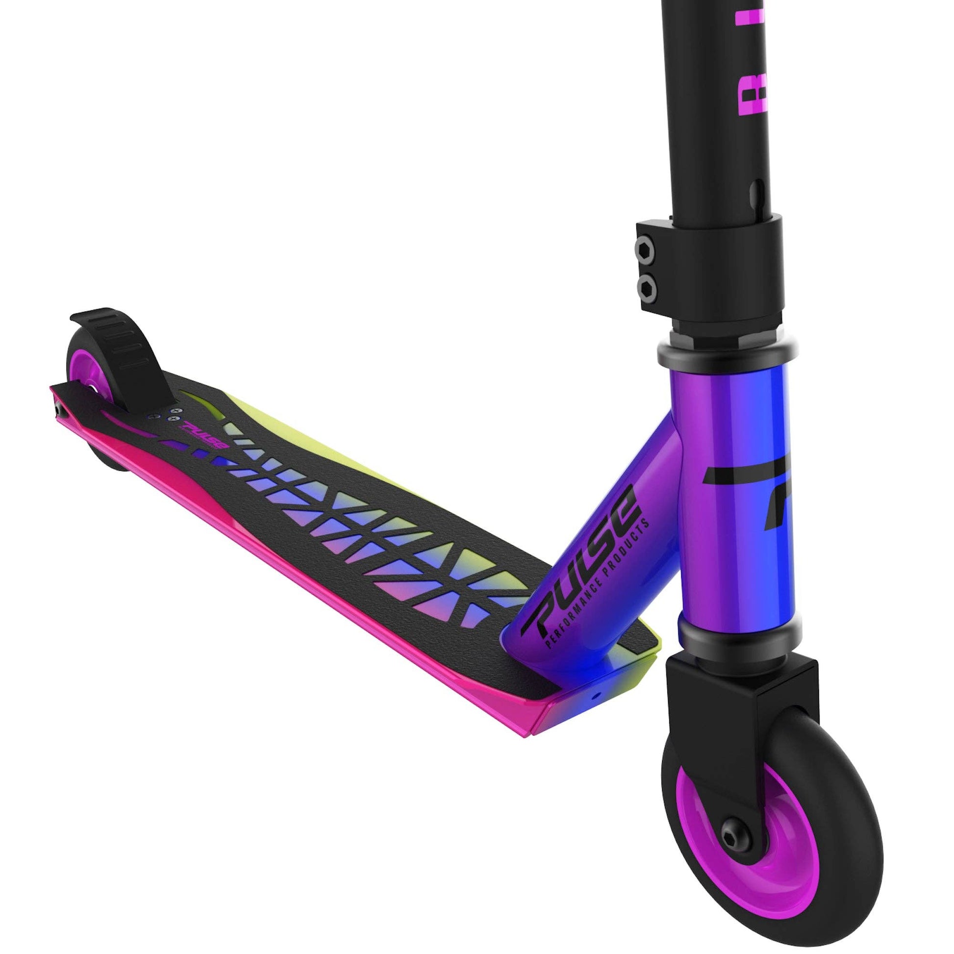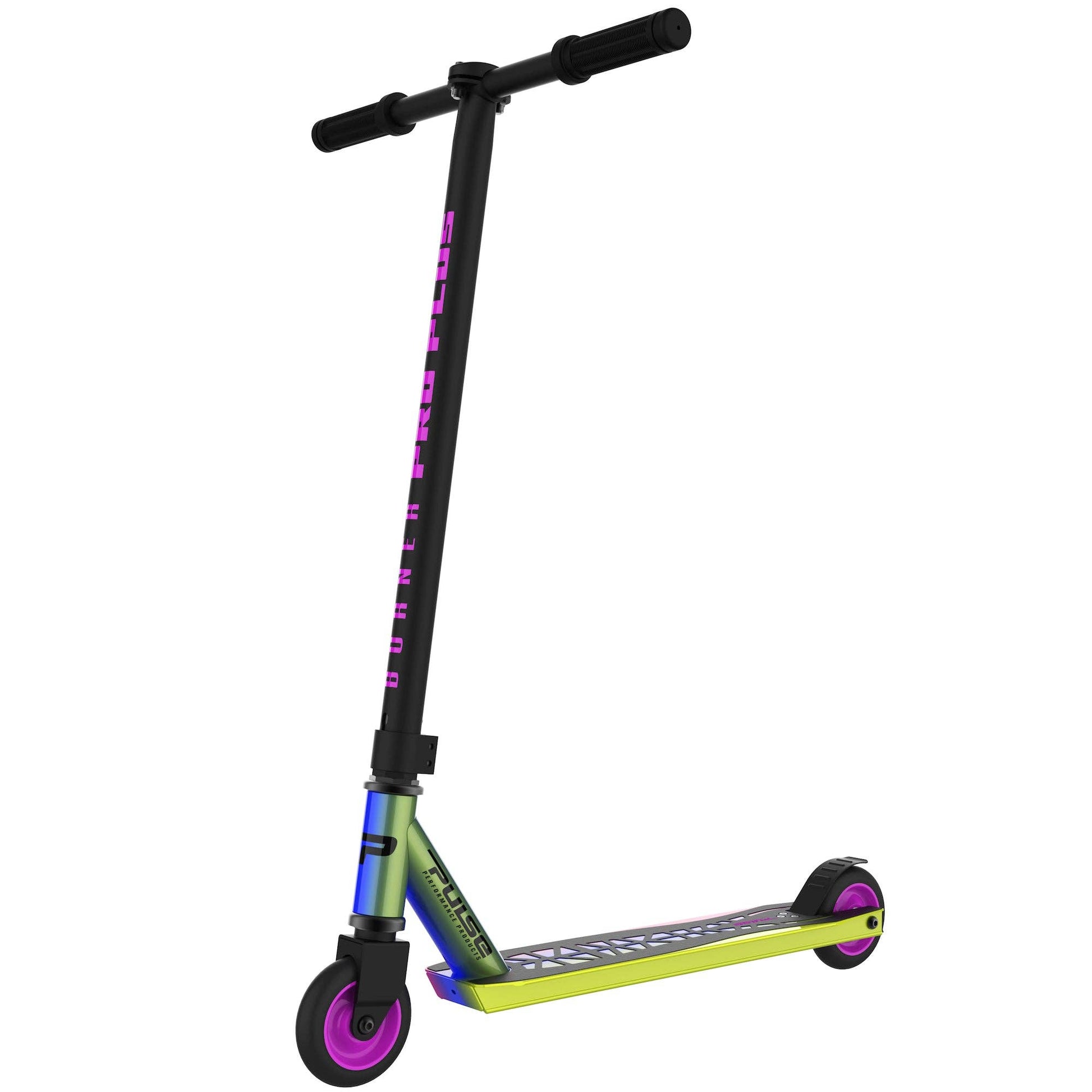 Pulse Performance Products Burner Pro Plus Freestyle Scooter Made for the impact of play, the Pulse Performance Products Burner Pro Plus Freestyle Scooter is perfect for beginner to intermediate riders! The reinforced steel handlebar, heat-treated aluminum frame with an oil slick finish, hi-impact solid-core urethane wheels makes for a durable and long-lasting scooter. Your scooter comes with oversized handlebars with BMX style grips for great control, pro scooter bearings for a smooth ride, and a built-in rear foot brake for safe and easy stopping power.