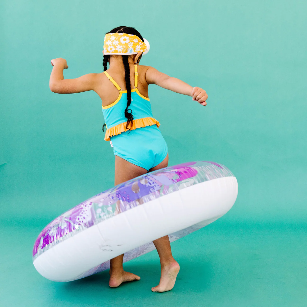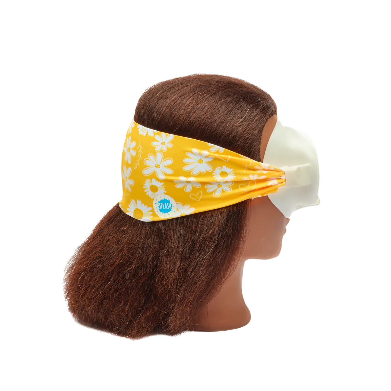 Our Daisy Love face mask swim goggle feature a bright yellow and white daisy print, paired with a white frame and clear lenses.